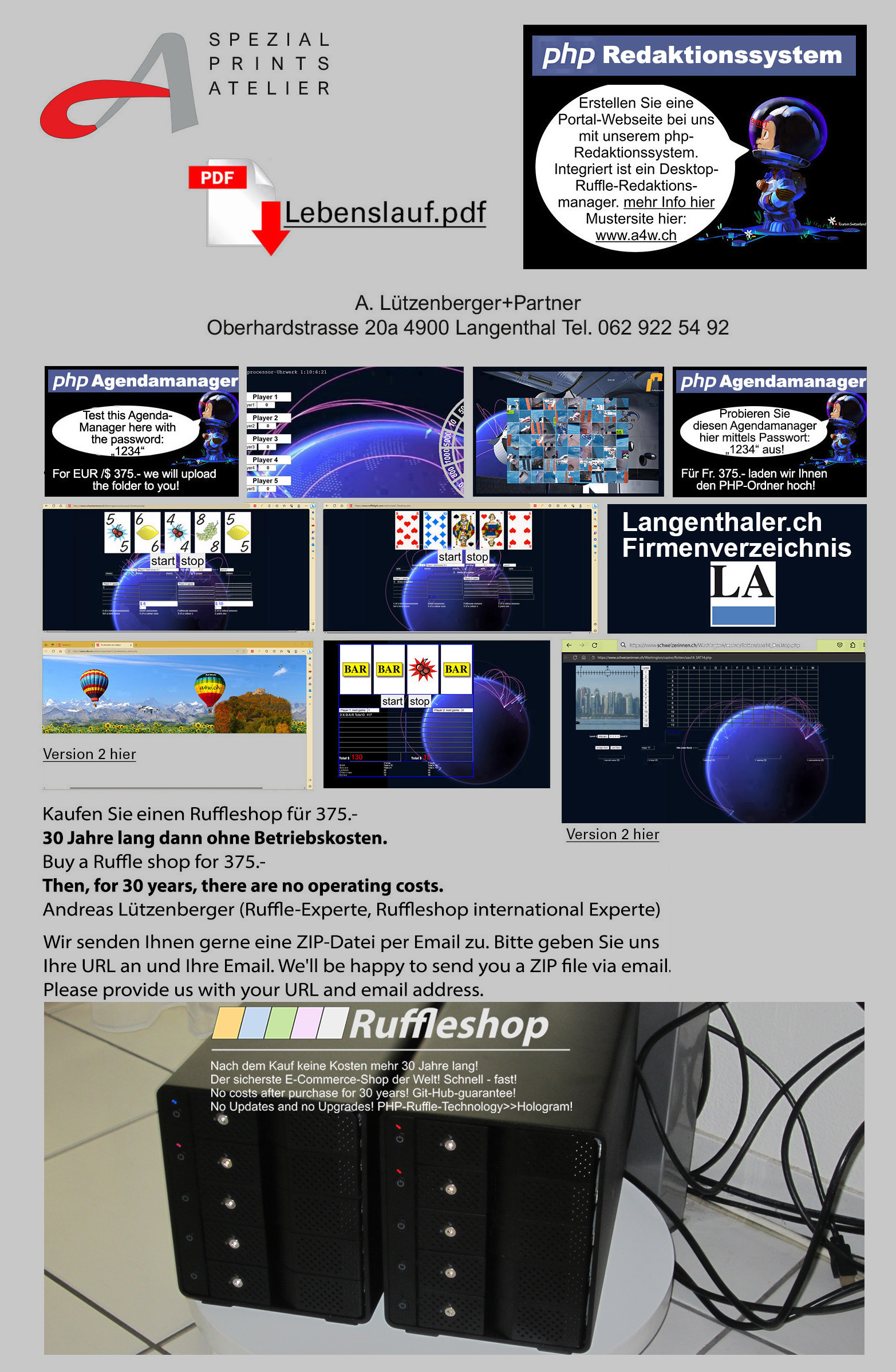 Kontakt: A4Web Werbeagentur Langenthal + Ruffle-Experte Ruffle läuft auf allen Geräten der Welt kostenlos und ohne Supportkosten! A4Web ist der günstigste Webdesign-Anbieter der Schweiz: Unser Ruffleshop (E-Commerce App auf Ruffle kostenlos laufend) läuft bei einer Mindest-Lebensdauer von 30 Jahren für sage und schreibe nur Euro/Fr. 1.04 pro Monat. Bei einer Mindest-Lebensdauer von 60 Jahren kostet der Ruffleshop nur Euro/Fr. 0.52 pro Monat. A4Web Advertising Agency Langenthal + Ruffle Expert Ruffle runs on all devices worldwide, free of charge and with no support fees! A4Web is the most affordable web design provider in Switzerland: Our Ruffleshop (an e-commerce app running on Ruffle, free of charge) runs for a minimum of 30 years for the incredibly low price of just Euro/US$ 1.04 per month. For a minimum of 60 years, the Ruffleshop costs only Euro/US$ 0.52 per month. A4Web Langenthal Andreas Lützenberger