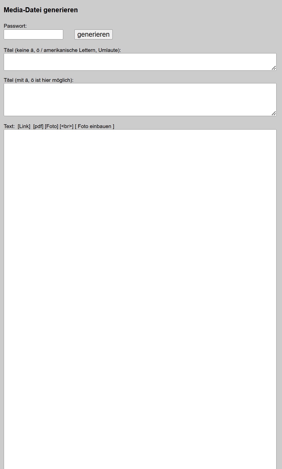 Beidenorts in allen Redaktionsmanagern kann man auf den Link «Media-Datei generieren» klicken, worauf der untenstehende Editor erscheint. Hier generiert unser System Ihnen die perfekte Vorlage in den Ordner «Media», welche Sie über WS-FTP in auf den Computer runterladen können in den Ordner «Media» und von dort aus im Editor editieren können. Falls die Bilder noch nicht drin sind (aus dem Manager generiert), können Sie oder wir respektive diese noch nachträglich einfüllen. Und dann die Datei wieder in den Ordner «Media» hochladen.